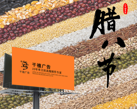 值此一年一度的臘八來(lái)臨之際,千禧廣告公司全體員工,向各位新老客戶以及關(guān)心支持我司的各界朋友,致以崇高的問(wèn)候!衷心祝福您和您的家人身體健康平安吉祥!千禧廣告專注于戶外廣告23年,我們將以更優(yōu)惠的價(jià)格,為您