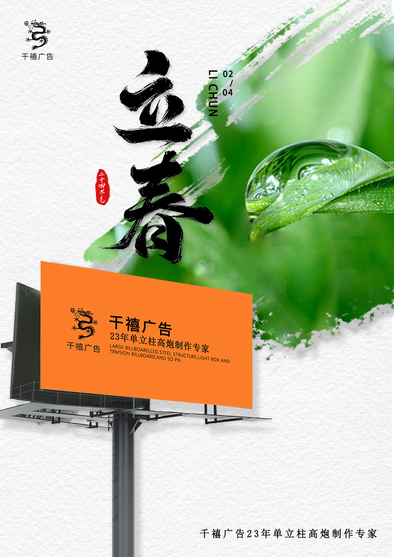 值此一年一度的立春臨之際,千禧廣告公司全體員工,向各位新老客戶以及關(guān)心支持我司的各界朋友,致以崇高的問(wèn)候!衷心祝福您和您的家人身體健康平安吉祥!千禧廣告專注于戶外廣告23年,我們將以更優(yōu)惠的價(jià)格,為您提