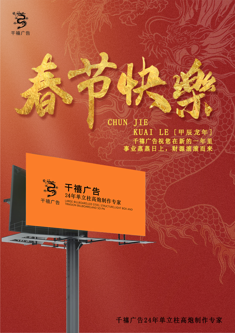 值此一年一度的春節(jié)臨之際,千禧廣告公司全體員工,向各位新老客戶以及關(guān)心支持我司的各界朋友,致以崇高的問(wèn)候!衷心祝福您和您的家人身體健康平安吉祥!千禧廣告專注于戶外廣告24年,我們將以更優(yōu)惠的價(jià)格,為您提