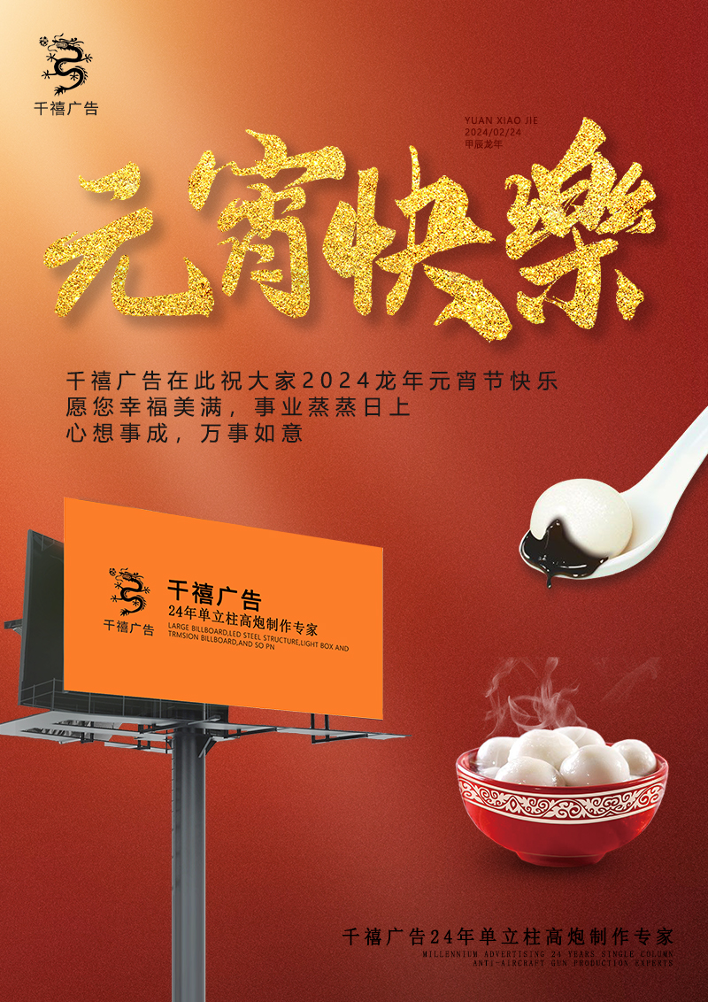 值此一年一度的元宵節(jié)來(lái)臨之際,千禧廣告公司全體員工,向各位新老客戶以及關(guān)心支持我司的各界朋友,致以崇高的問(wèn)候!衷心祝福您和您的家人身體健康平安吉祥!千禧廣告專注于戶外廣告23年,我們將以更優(yōu)惠的價(jià)格,為