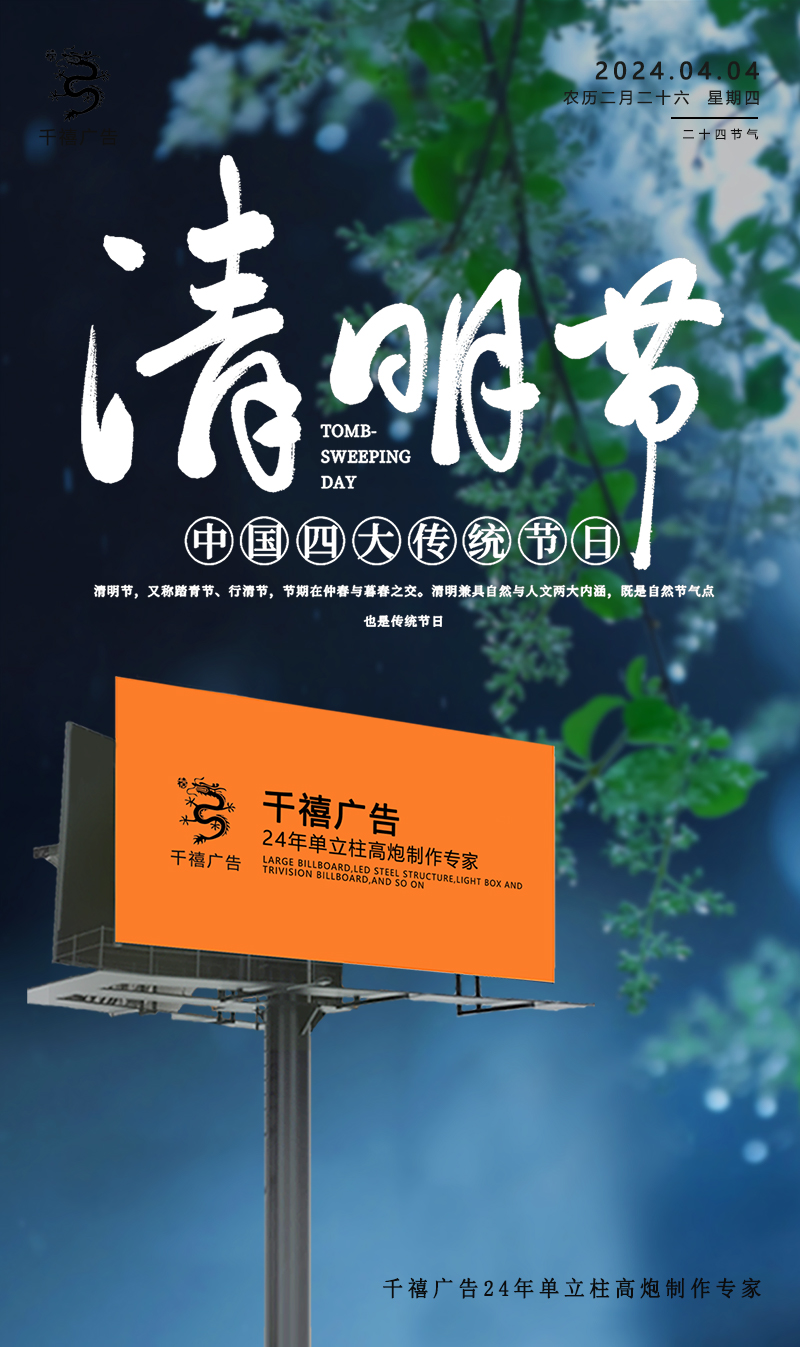 清明節(jié)將至,愿春風(fēng)拂去你的憂傷,細(xì)雨滋潤(rùn)你的心田。在這個(gè)特殊的時(shí)刻,愿你珍惜眼前人,銘記過(guò)去情。愿你的生活如春日般溫暖,如夏花般絢爛,幸福安康,歲歲平安。千禧廣告專注于戶外廣告24年,我們將以更優(yōu)惠的價(jià)