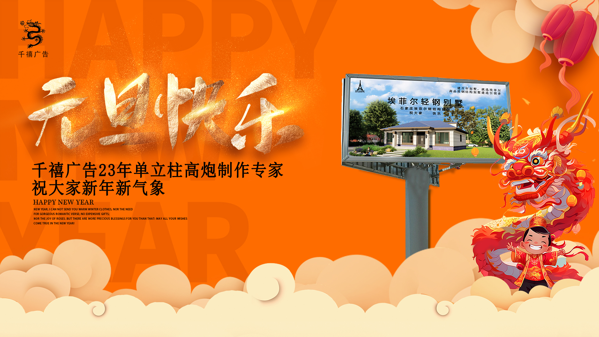 值此一年一度的元旦來(lái)臨之際,千禧廣告公司全體員工,向各位新老客戶以及關(guān)心支持我司的各界朋友,致以崇高的問(wèn)候!衷心祝福您和您的家人身體健康平安吉祥!千禧廣告專注于戶外廣告23年,我們將以更優(yōu)惠的價(jià)格,為您