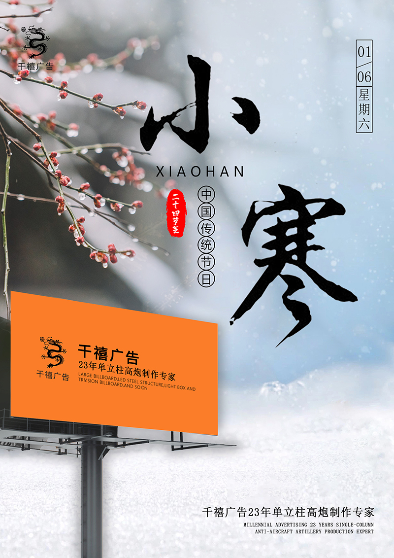 值此一年一度的小寒來(lái)臨之際,千禧廣告公司全體員工,向各位新老客戶以及關(guān)心支持我司的各界朋友,致以崇高的問(wèn)候!衷心祝福您和您的家人身體健康平安吉祥!千禧廣告專注于戶外廣告23年,我們將以更優(yōu)惠的價(jià)格,為您